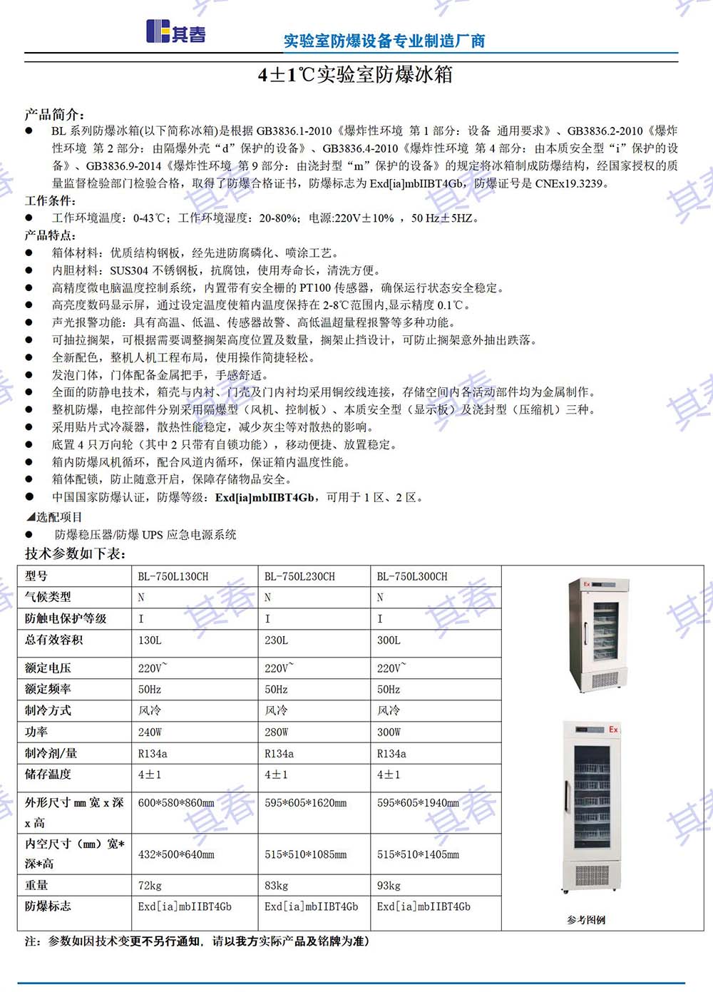 2023-06-05 3300BL系列4度恒温防爆冰箱具有以下特点:箱体材料采用优质结构钢板,经过先进防腐磷化、喷涂工艺制成;内胆材料采用SUS304不锈钢板,具有抗腐蚀和使用寿命长的特点,清洗方便;高精度微电脑温度控制系统内置带有安全栅的PT100传感器,确保运行状态的安全稳定;高亮度数码显示屏,通过设定温度使箱内温度保持在2-8℃范围内,显示精度为0.1℃;4度恒温防爆冰箱声光报警功能具有高温、低温、传感器故警、高低温超量程报警等多种功能;可抽拉搁架可根据需要调整搁架高度位置及数量,搁架止挡设计可防止搁架意外抽出跌落;全新配色,整机人机工程布局,使用操作简捷轻松;发泡门体,门体配备金属把手,手感舒适;全面的防静电技术,箱壳与内衬、门壳及门内衬均采用铜绞线连接,存储空间内各活动部件均为金属制作;整机防爆,电控部件分别采用隔爆型(风机、控制板)、本质安全型(显示板)及浇封型(压缩机)三种;4度恒温防爆冰箱采用贴片式冷凝器,散热性能稳定,减少灰尘等对散热的影响;底置4只万向轮(其中2只带有自锁功能),移动便捷、放置稳定;箱内防爆风机循环,配合风道内循环,保证箱内温度性能;4度恒温防爆冰箱箱体配锁,防止随意开启,保障物品安全。